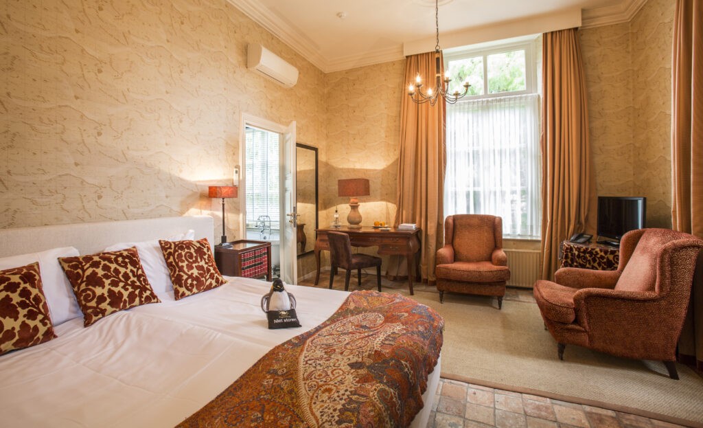 Uniek overnachten in een kasteel. De 40 hotelkamers en suites liggen verspreid over historische gebouwen zoals het Koetshuis, de Orangerie en het Kaapse Huis. Elke kamer is uniek ingericht met oog voor detail, rijke stoffen en antieke meubelen. Een plek waar historie en comfort elkaar vinden.